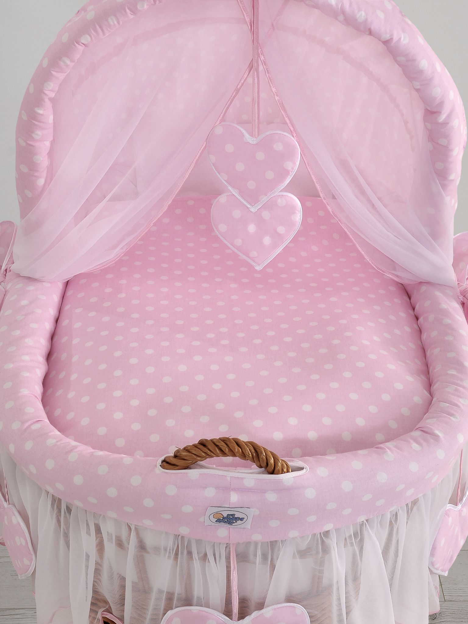 Rieten Babymand met Kap Roze Polkaprikker Amelie