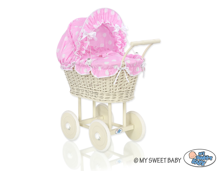 Kleinbaby.nl » Speelgoed Knuffels » Poppenwagens en Speelgoed » Poppenwagen van Riet » Poppenwagen Rotan Ivoor » Rieten Poppenwagen met Beddengoed Ivoor Roze Polkaprikker