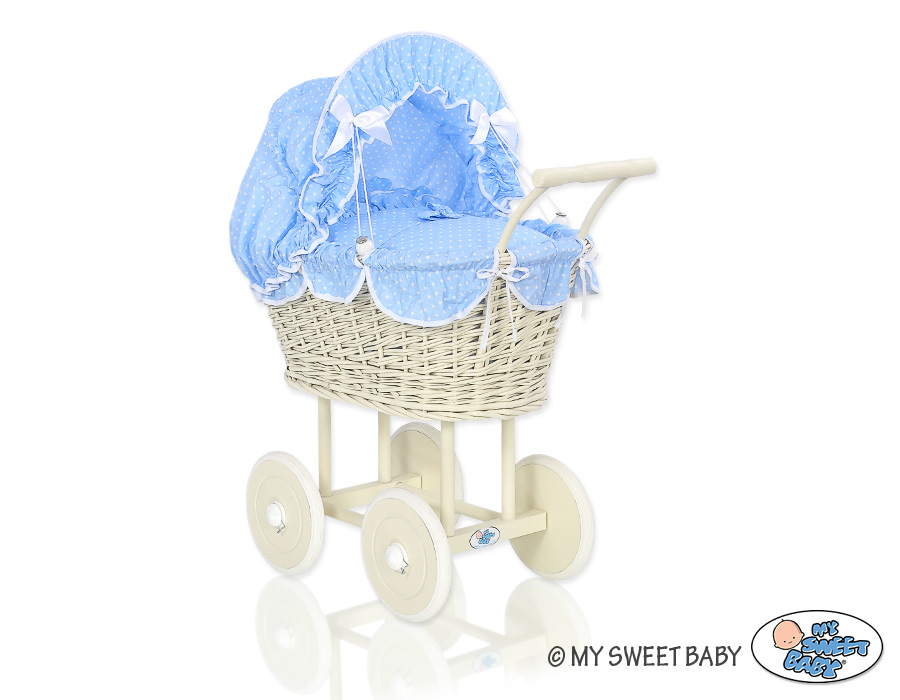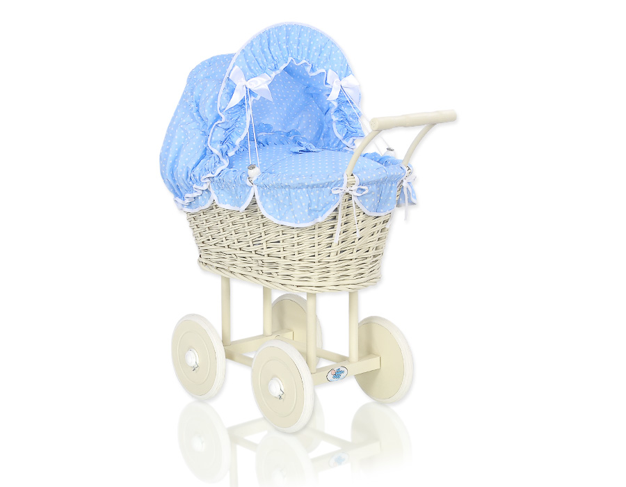 Kleinbaby.nl » Speelgoed Knuffels » Poppenwagens en Speelgoed » Poppenwagen van Riet » Poppenwagen Rotan Ivoor » Rieten Poppenwagen met Beddengoed Ivoor Wit Blauw Polkaprikker