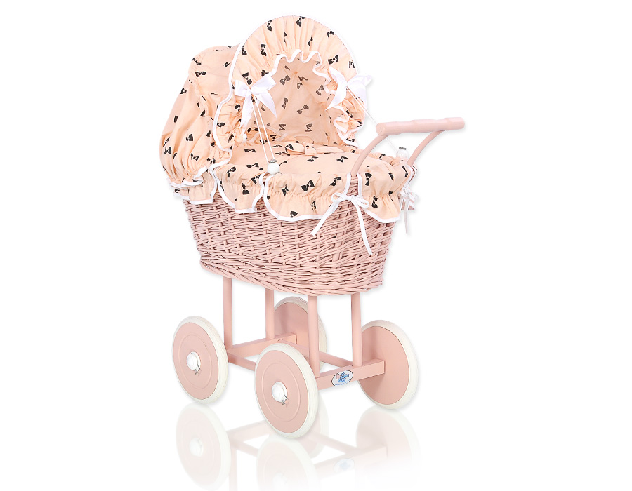 Kleinbaby.nl » Speelgoed Knuffels » Poppenwagens en Speelgoed » Poppenwagen van Riet » Poppenwagen Riet Poederroze » Rieten Poppenwagen met Beddengoed Lussen Poederroze