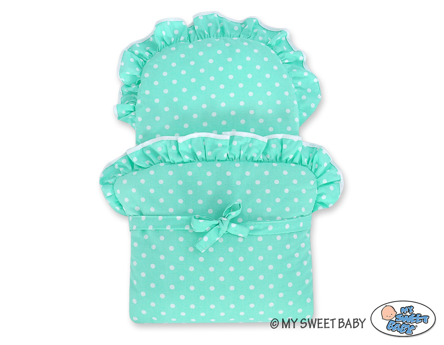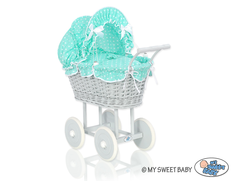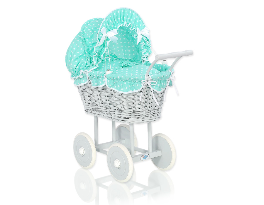 Kleinbaby.nl » Speelgoed Knuffels » Poppenwagens en Speelgoed » Poppenwagen van Riet » Poppenwagen Riet Grijs » Rieten Poppenwagen met Beddengoed Mint Grijs Polkaprikker