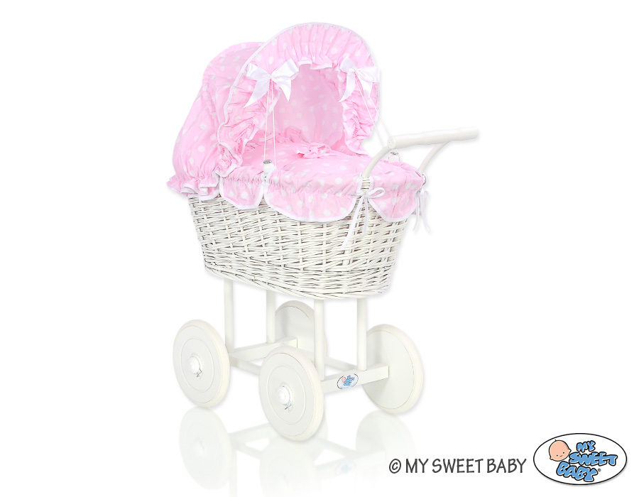 Kleinbaby.nl » Speelgoed Knuffels » Poppenwagens en Speelgoed » Poppenwagen van Riet » Rieten Poppenwagens » Rieten Poppenwagen met Beddengoed Roze Polkaprikker