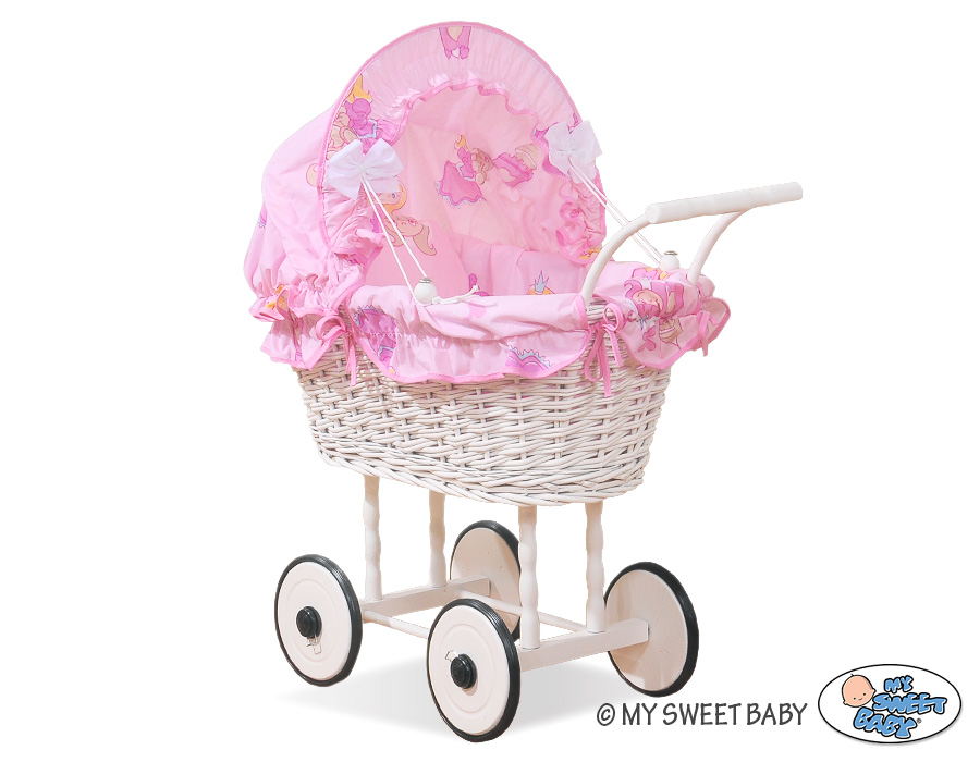 Kleinbaby.nl » Speelgoed Knuffels » Poppenwagens en Speelgoed » Poppenwagen van Riet » Rieten Poppenwagens » Rieten Poppenwagen met Beddengoed Roze Wit