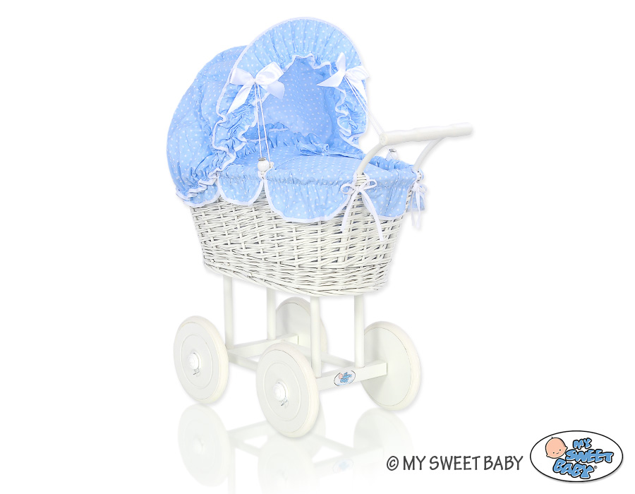 Kleinbaby.nl » Speelgoed Knuffels » Poppenwagens en Speelgoed » Poppenwagen van Riet » Rieten Poppenwagens » Rieten Poppenwagen met Beddengoed Wit Blauw Polkaprikker