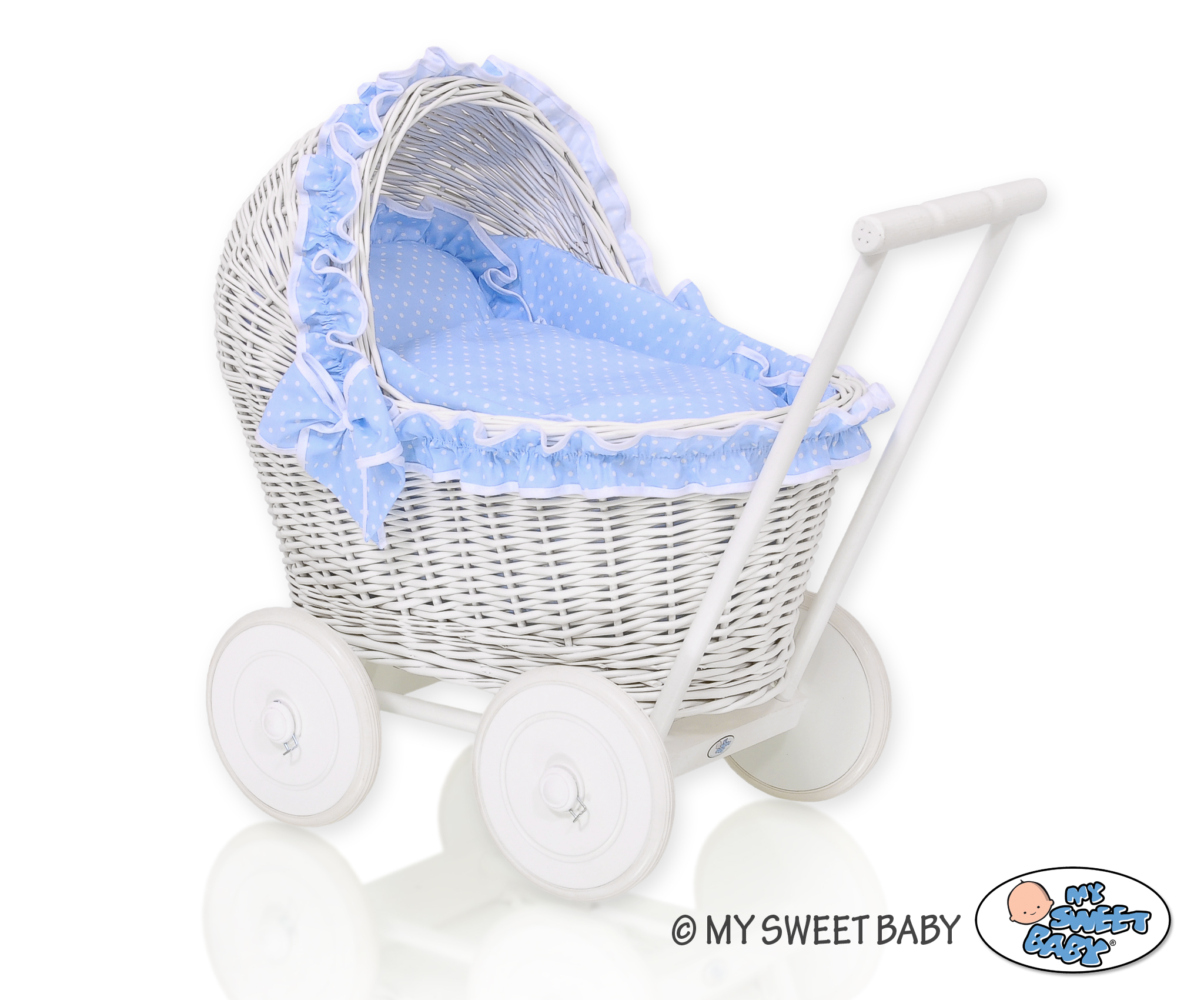 Kleinbaby.nl » Speelgoed Knuffels » Poppenwagens en Speelgoed » Poppenwagen van Riet » Rieten Poppenwagens » Rieten Poppenwagen met Beddengoed Wit Blauw Polkaprikker