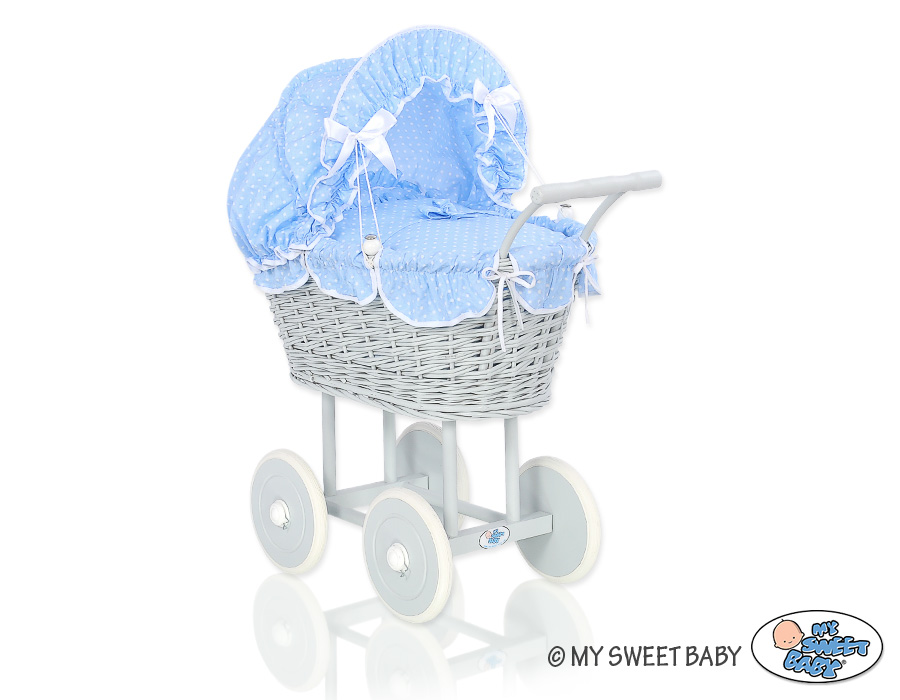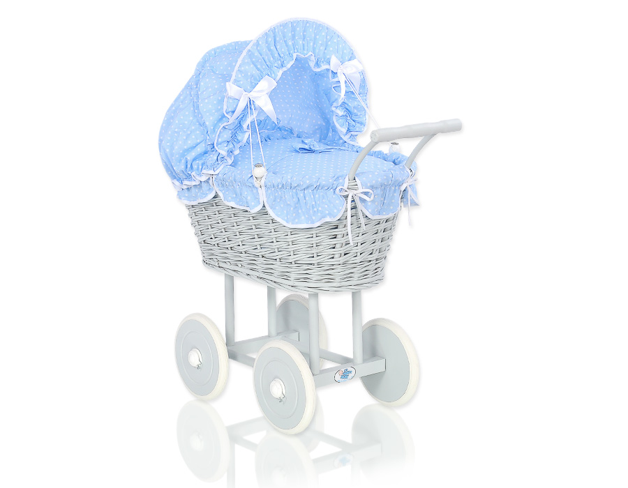 Kleinbaby.nl » Speelgoed Knuffels » Poppenwagens en Speelgoed » Poppenwagen van Riet » Poppenwagen Riet Grijs » Rieten Poppenwagen met Beddengoed Wit Grijs Blauw Polkaprikker