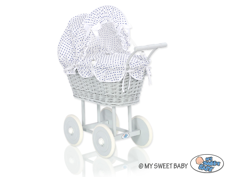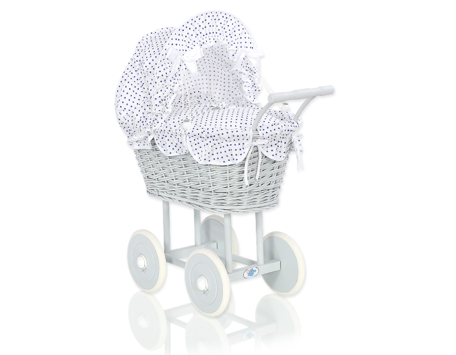 Kleinbaby.nl » Speelgoed Knuffels » Poppenwagens en Speelgoed » Poppenwagen van Riet » Poppenwagen Riet Grijs » Rieten Poppenwagen met Beddengoed Wit Grijs Marineblauw Polkaprikker