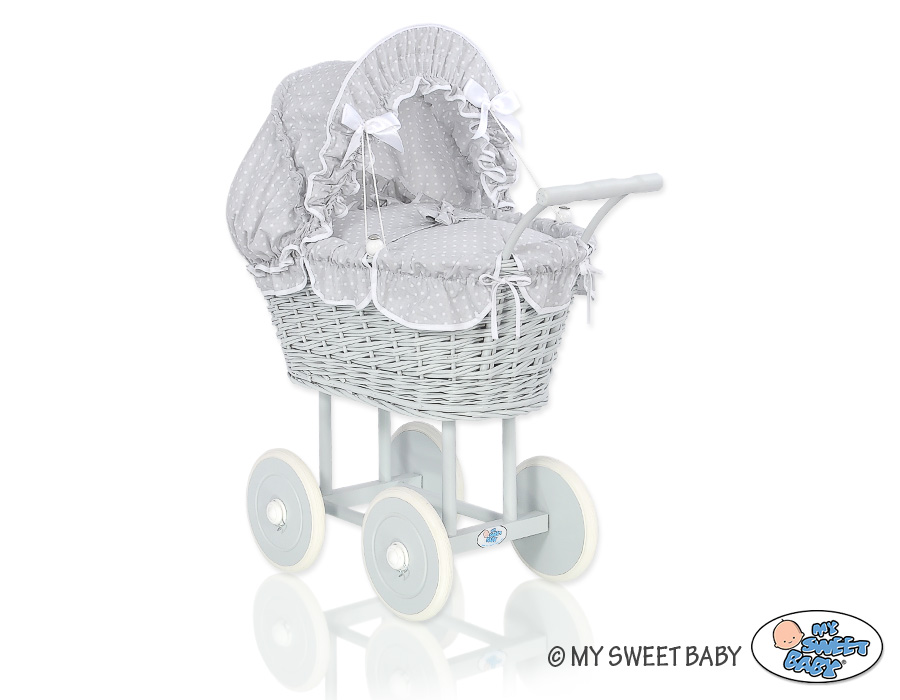 Kleinbaby.nl » Speelgoed Knuffels » Poppenwagens en Speelgoed » Poppenwagen van Riet » Poppenwagen Riet Grijs » Rieten Poppenwagen met Beddengoed Wit Grijs Polkaprikker