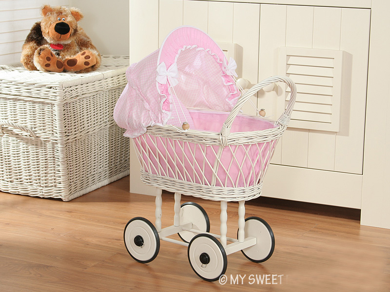 Kleinbaby.nl » Speelgoed Knuffels » Poppenwagens en Speelgoed » Poppenwagen van Riet » Rieten Poppenwagens » Rieten Poppenwagen met Beddengoed Wit