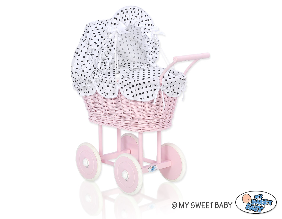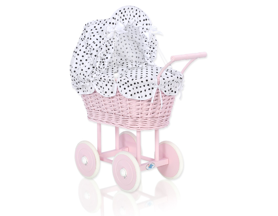 Kleinbaby.nl » Speelgoed Knuffels » Poppenwagens en Speelgoed » Poppenwagen van Riet » Poppenwagen Riet Roze » Rieten Poppenwagen met Beddengoed Wit Zwart Polkaprikker