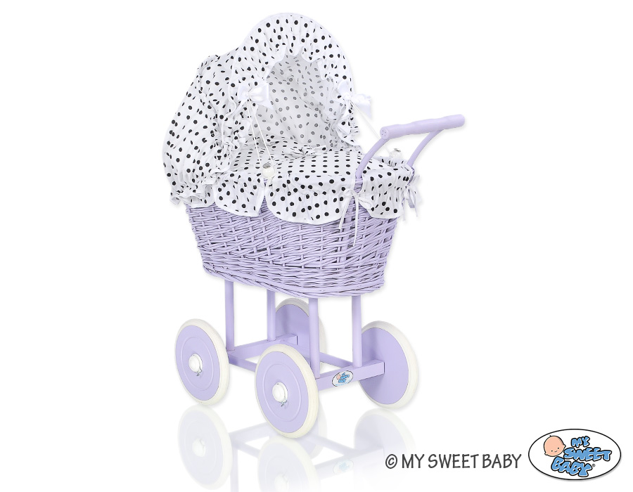 Kleinbaby.nl » Speelgoed Knuffels » Poppenwagens en Speelgoed » Poppenwagen van Riet » Poppenwagen van paars rotan » Rieten Poppenwagen met Beddengoed Wit Zwart Purper Polkaprikker