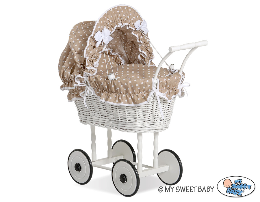 Kleinbaby.nl » Speelgoed Knuffels » Poppenwagens en Speelgoed » Poppenwagen van Riet » Rieten Poppenwagens » Rieten Poppenwagen met Beddengoedset Bruin Wit Polkaprikker