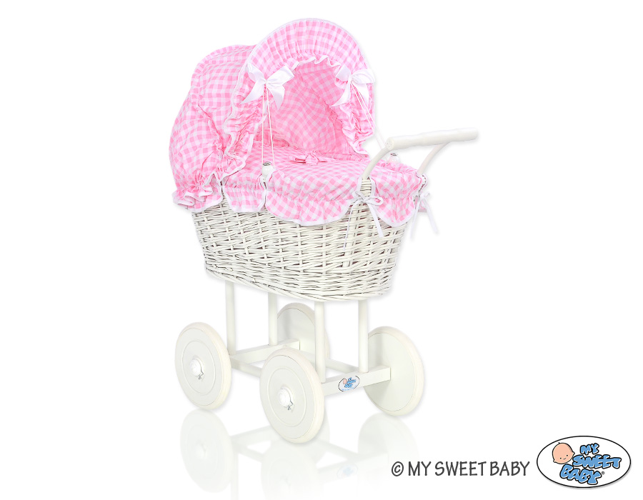 Kleinbaby.nl » Speelgoed Knuffels » Poppenwagens en Speelgoed » Poppenwagen van Riet » Rieten Poppenwagens » Rieten Poppenwagen met Beddengoedset Roze Geruit