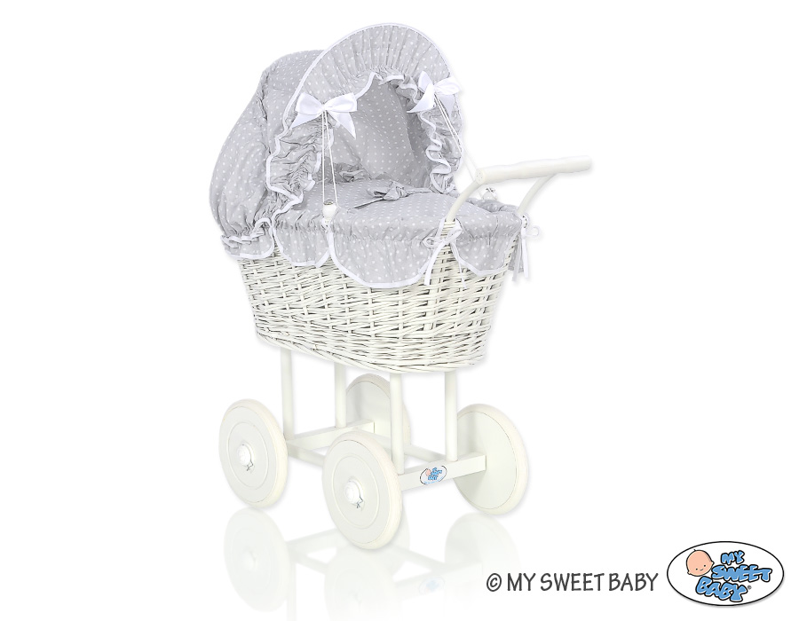 Kleinbaby.nl » Speelgoed Knuffels » Poppenwagens en Speelgoed » Poppenwagen van Riet » Rieten Poppenwagens » Rieten Poppenwagen met Beddengoedset Wit Grijs Polkaprikker