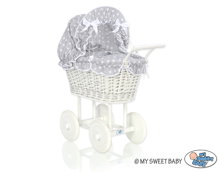 Kleinbaby.nl » Speelgoed Knuffels » Poppenwagens en Speelgoed » Poppenwagen van Riet » Rieten Poppenwagens » Rieten Poppenwagen met Beddengoedset Wit Grijs Polkaprikker