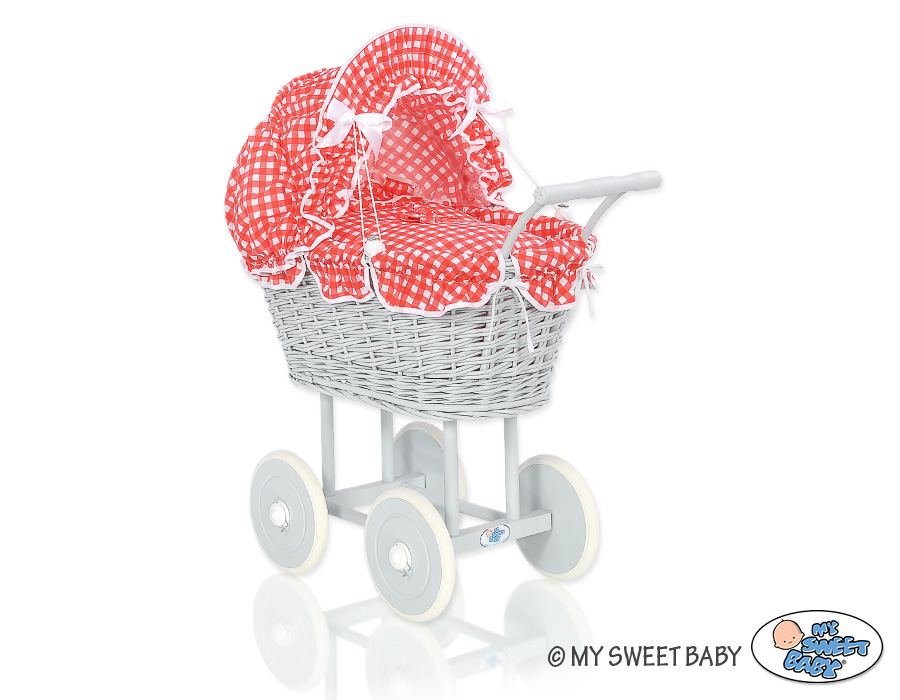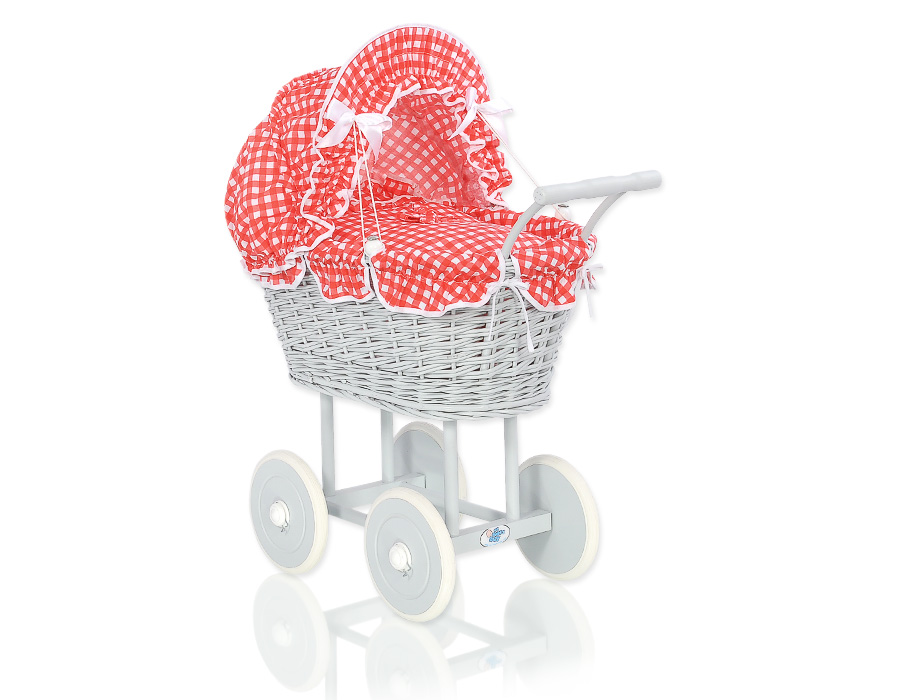 Kleinbaby.nl » Speelgoed Knuffels » Poppenwagens en Speelgoed » Poppenwagen van Riet » Poppenwagen Riet Grijs » Rieten poppenwagen met kap Grijs Rood Geruit
