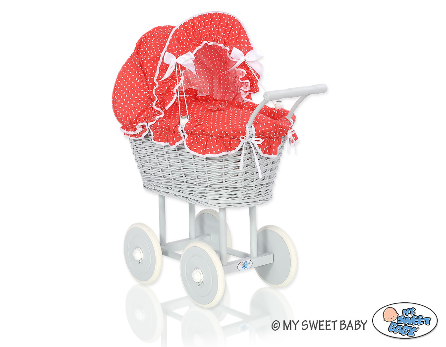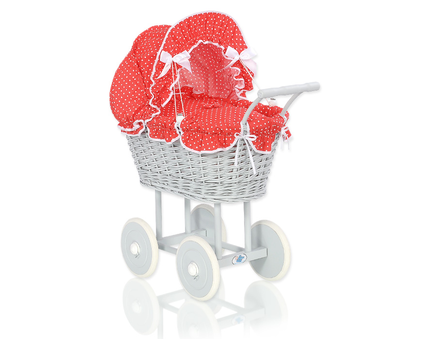 Kleinbaby.nl » Speelgoed Knuffels » Poppenwagens en Speelgoed » Poppenwagen van Riet » Poppenwagen Riet Grijs » Rieten poppenwagen met kap Grijs Rood Polkaprikker