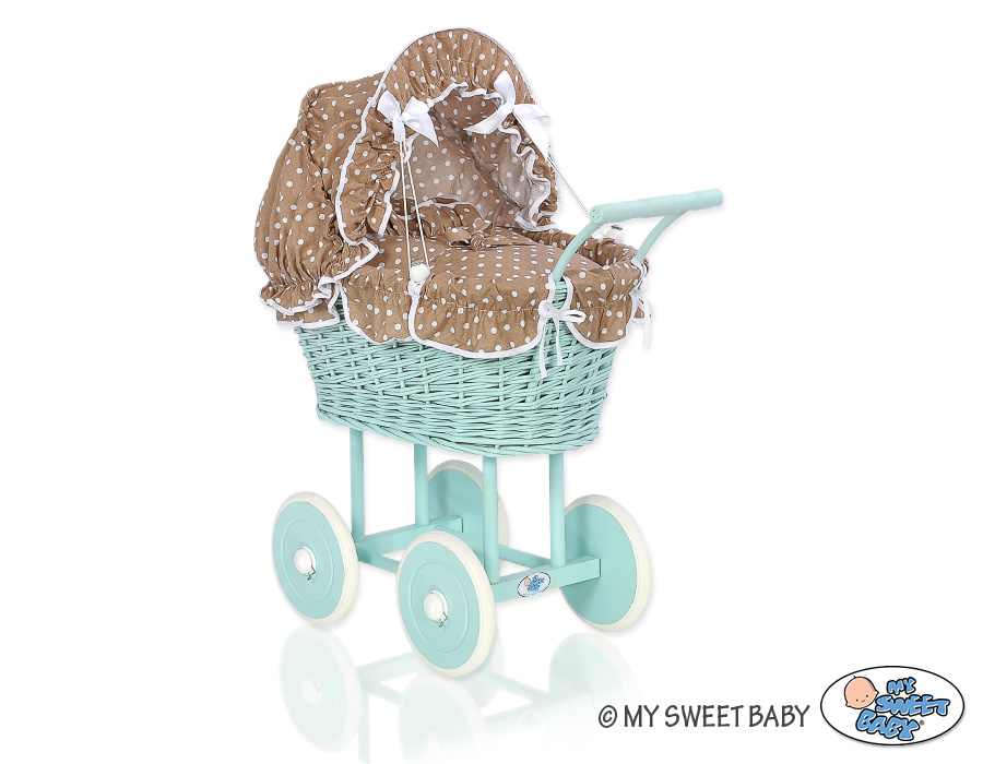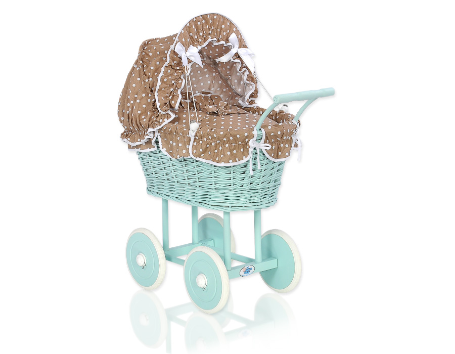 Kleinbaby.nl » Speelgoed Knuffels » Poppenwagens en Speelgoed » Poppenwagen van Riet » Houten Poppenwagen Mint » Rieten poppenwagen met kap Mint Bruin Polkaprikker