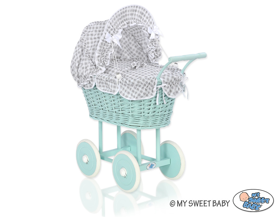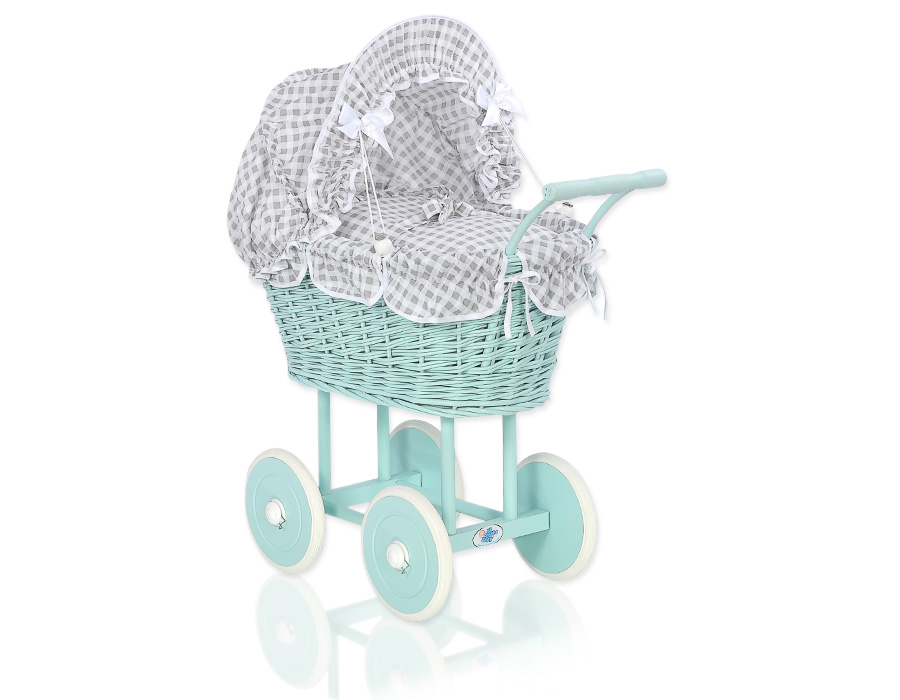 Kleinbaby.nl » Speelgoed Knuffels » Poppenwagens en Speelgoed » Poppenwagen van Riet » Houten Poppenwagen Mint » Rieten poppenwagen met kap Mint Grijs Geruit