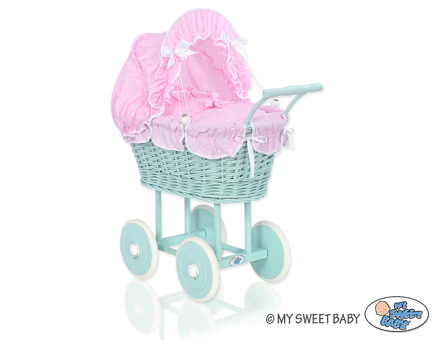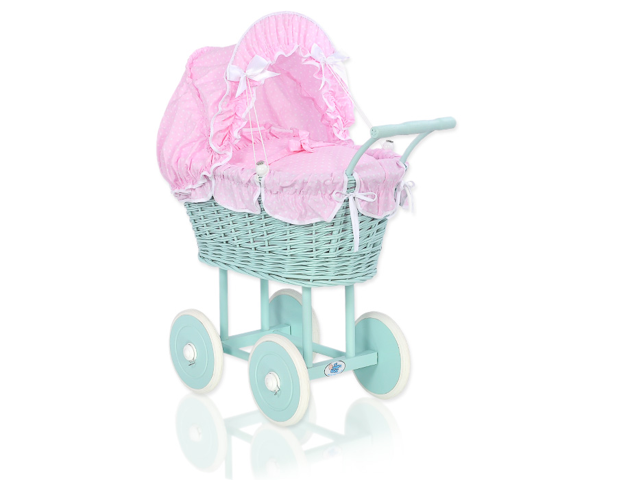Kleinbaby.nl » Speelgoed Knuffels » Poppenwagens en Speelgoed » Poppenwagen van Riet » Houten Poppenwagen Mint » Rieten poppenwagen met kap Mint Roze Wit Polkaprikker
