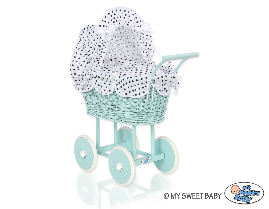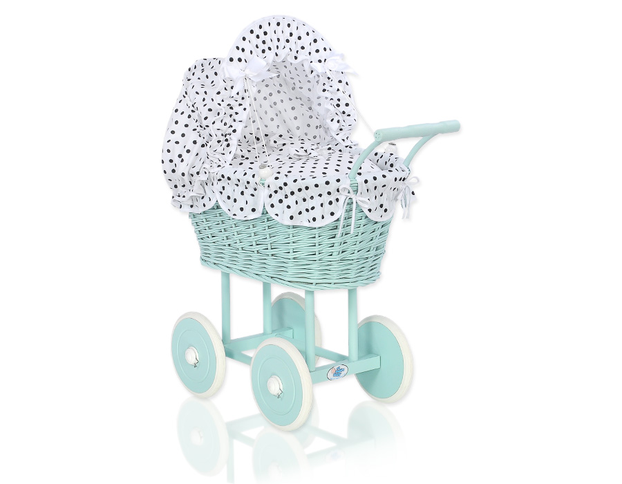 Kleinbaby.nl » Speelgoed Knuffels » Poppenwagens en Speelgoed » Poppenwagen van Riet » Houten Poppenwagen Mint » Rieten poppenwagen met kap Mint Wit Zwart Polkaprikker