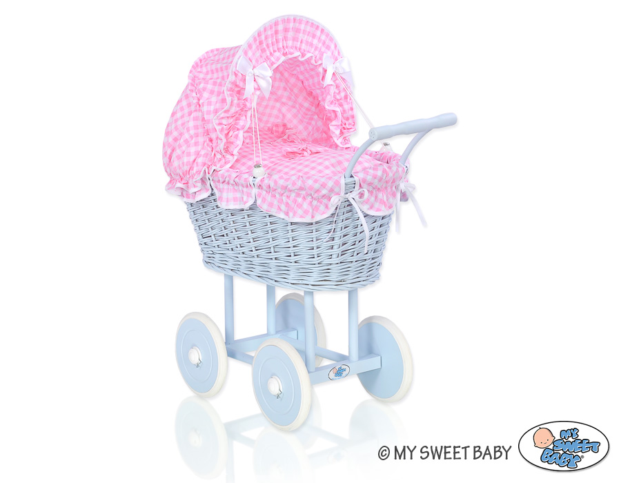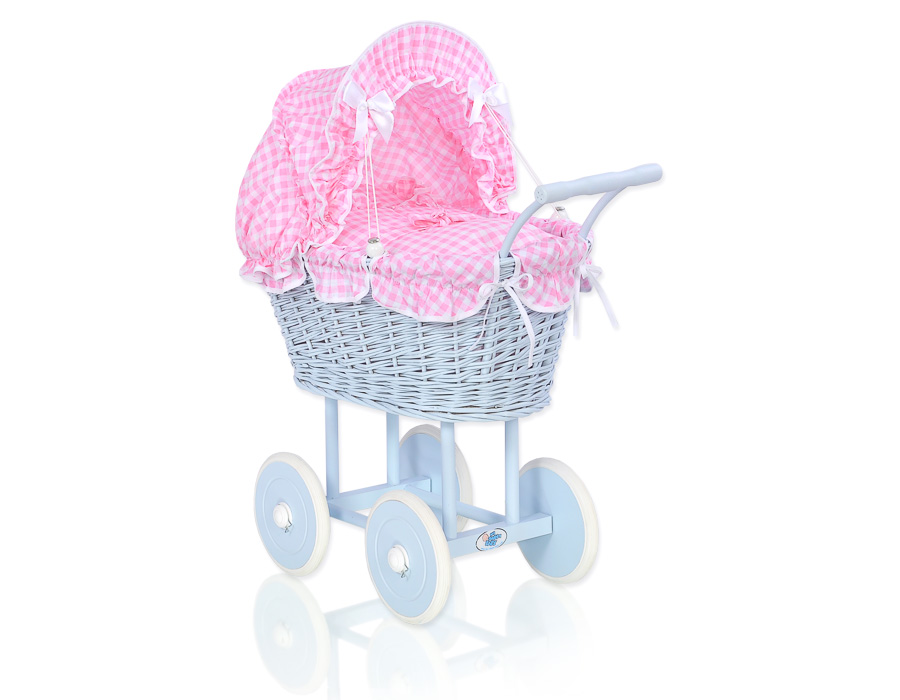 Kleinbaby.nl » Speelgoed Knuffels » Poppenwagens en Speelgoed » Poppenwagen van Riet » Rieten Poppenwagens Blauw » Rieten poppenwagen met kap Roze Blauw Geruit