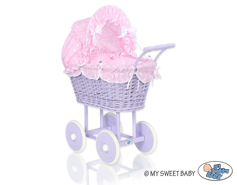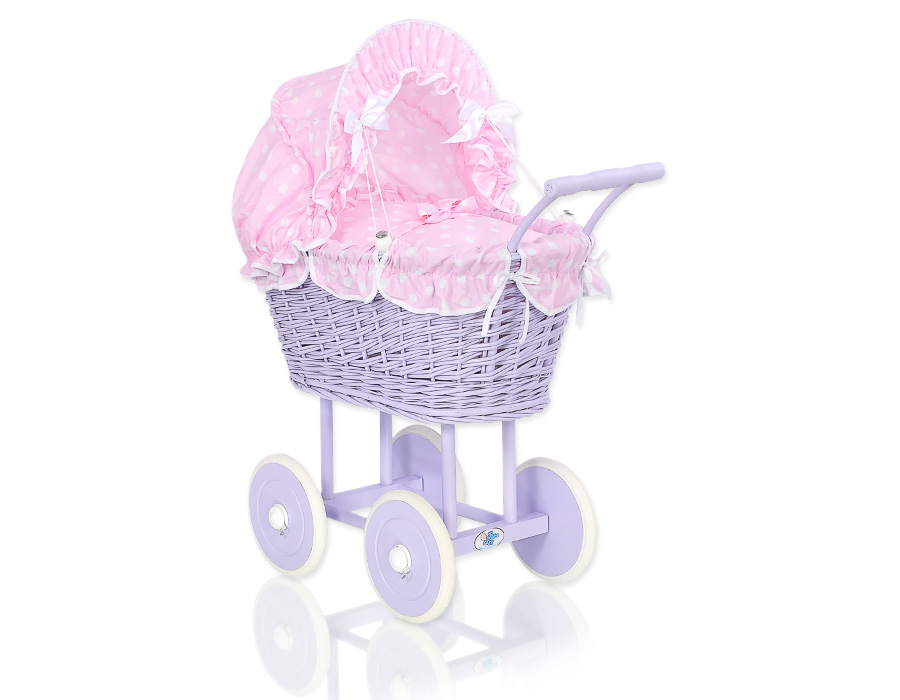 Kleinbaby.nl » Speelgoed Knuffels » Poppenwagens en Speelgoed » Poppenwagen van Riet » Poppenwagen van paars rotan » Rieten poppenwagen met kap Roze Purper Polkaprikker