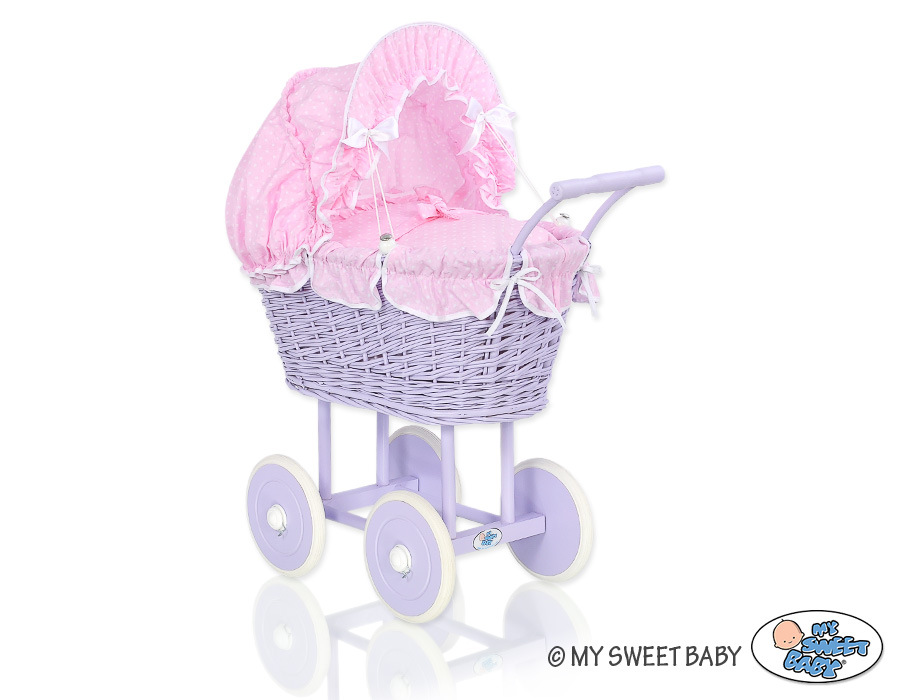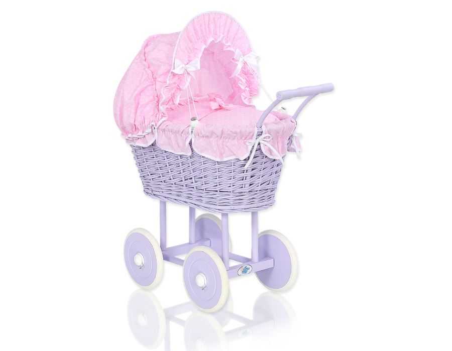 Kleinbaby.nl » Speelgoed Knuffels » Poppenwagens en Speelgoed » Poppenwagen van Riet » Poppenwagen van paars rotan » Rieten poppenwagen met kap Roze Wit Purper Polkaprikker