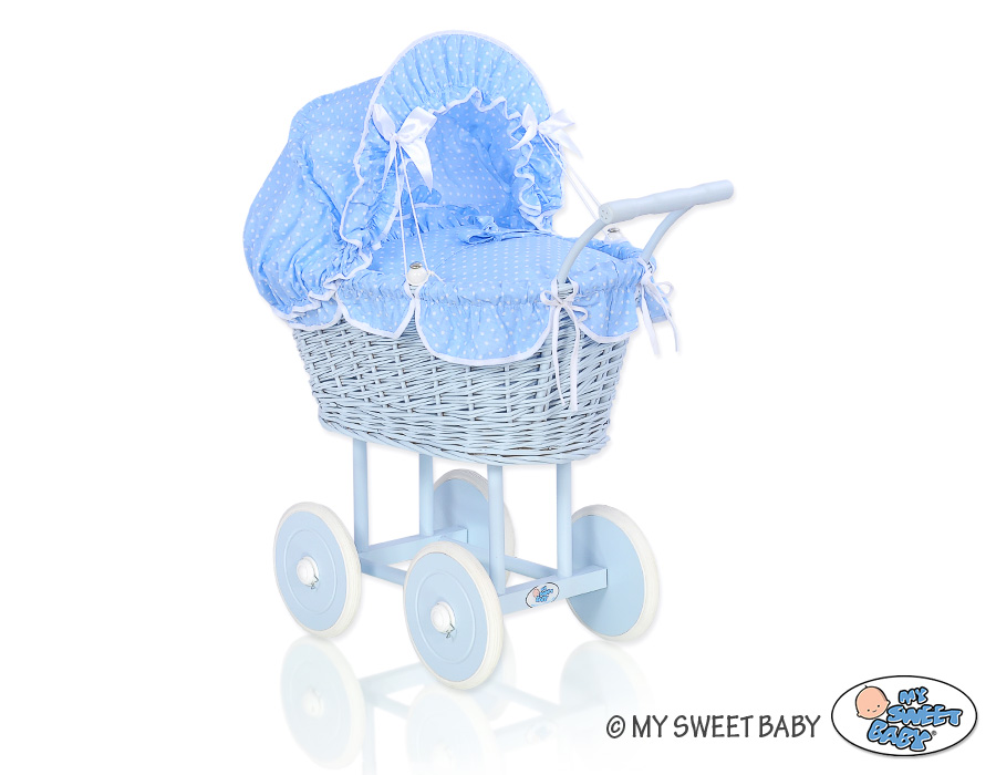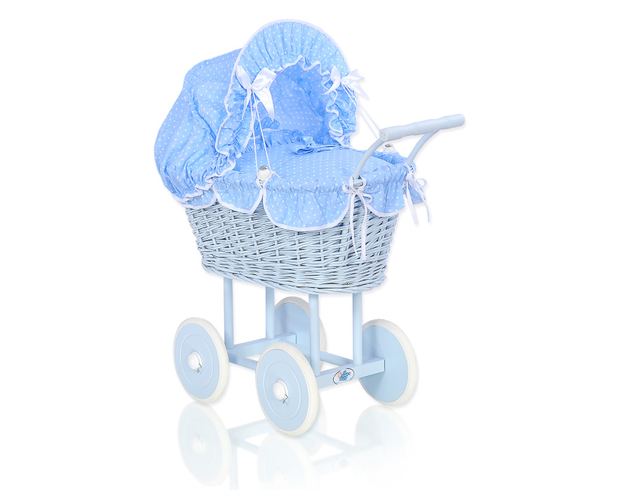 Kleinbaby.nl » Speelgoed Knuffels » Poppenwagens en Speelgoed » Poppenwagen van Riet » Rieten Poppenwagens Blauw » Rieten poppenwagen met kap Wit Blauw Polkaprikker
