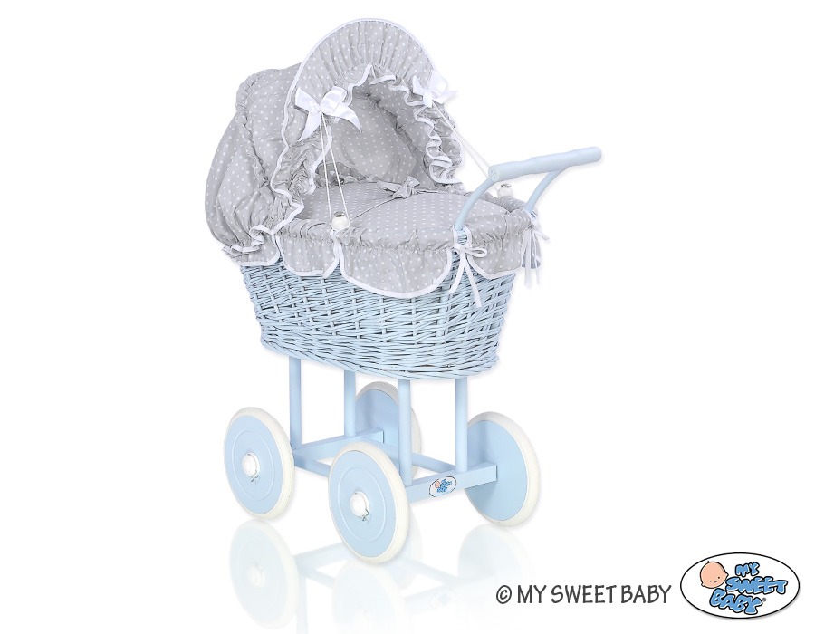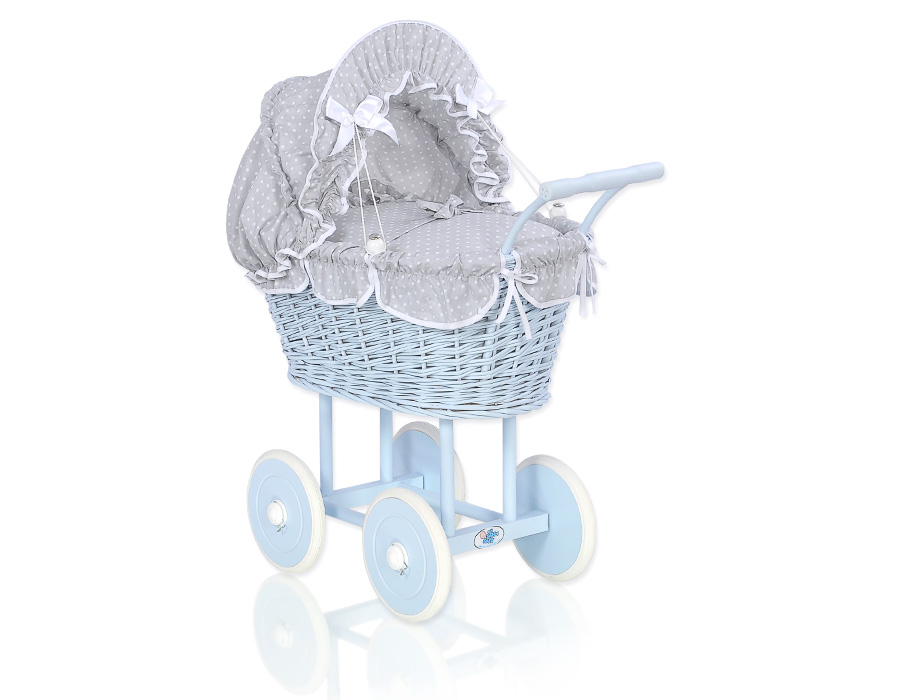 Kleinbaby.nl » Speelgoed Knuffels » Poppenwagens en Speelgoed » Poppenwagen van Riet » Rieten Poppenwagens Blauw » Rieten poppenwagen met kap Wit Grijs Blauw Polkaprikker