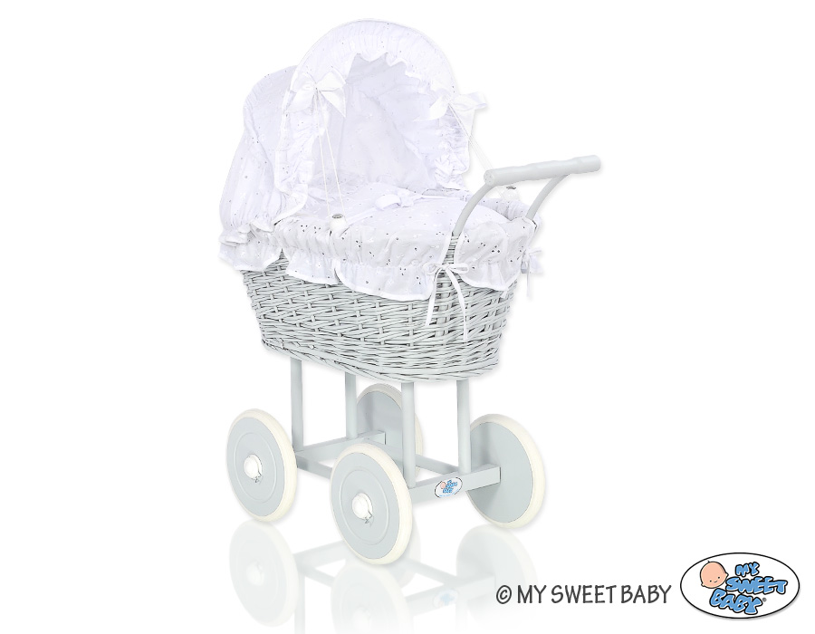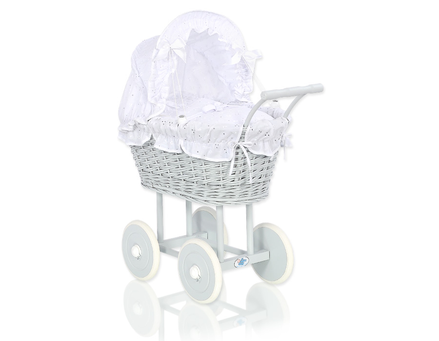 Kleinbaby.nl » Speelgoed Knuffels » Poppenwagens en Speelgoed » Poppenwagen van Riet » Poppenwagen Riet Grijs » Rieten poppenwagen met kap Wit Grijs