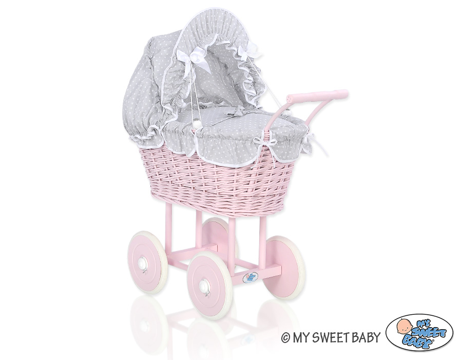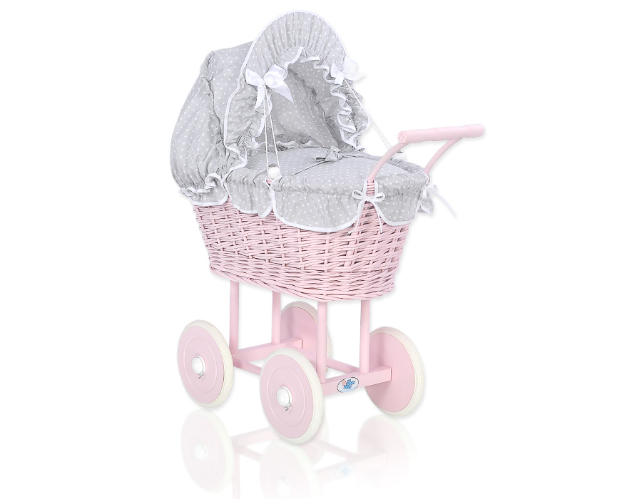 Kleinbaby.nl » Speelgoed Knuffels » Poppenwagens en Speelgoed » Poppenwagen van Riet » Poppenwagen Riet Roze » Rieten poppenwagen met kap Wit Grijs Polkaprikker Stofroze