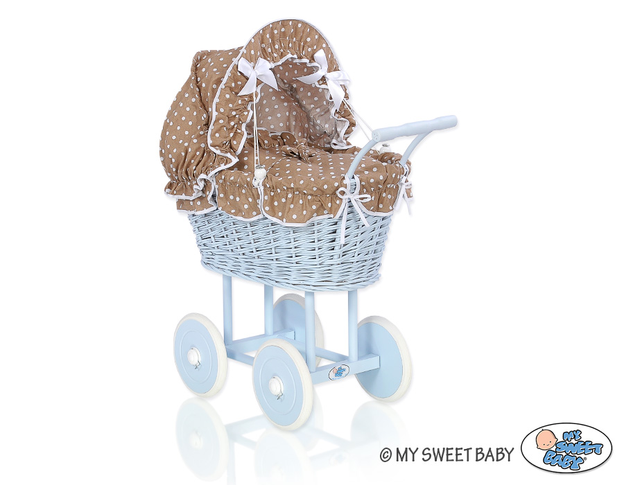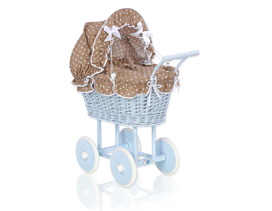 Kleinbaby.nl » Speelgoed Knuffels » Poppenwagens en Speelgoed » Poppenwagen van Riet » Rieten Poppenwagens Blauw » Rieten poppenwagen met stoffen kap Bruin Blauw Polkaprikker