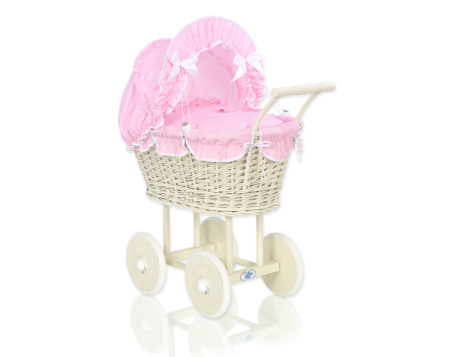 Rieten poppenwagen met stoffen kap Ivoor Roze Geruit