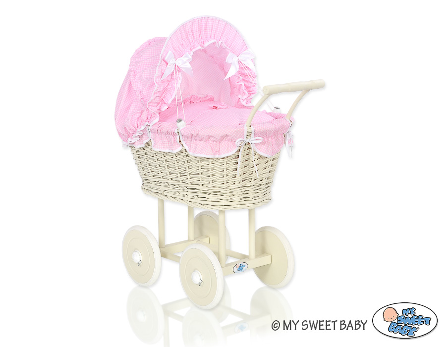 Kleinbaby.nl » Speelgoed Knuffels » Poppenwagens en Speelgoed » Poppenwagen van Riet » Poppenwagen Rotan Ivoor » Rieten poppenwagen met stoffen kap Ivoor Roze Geruit