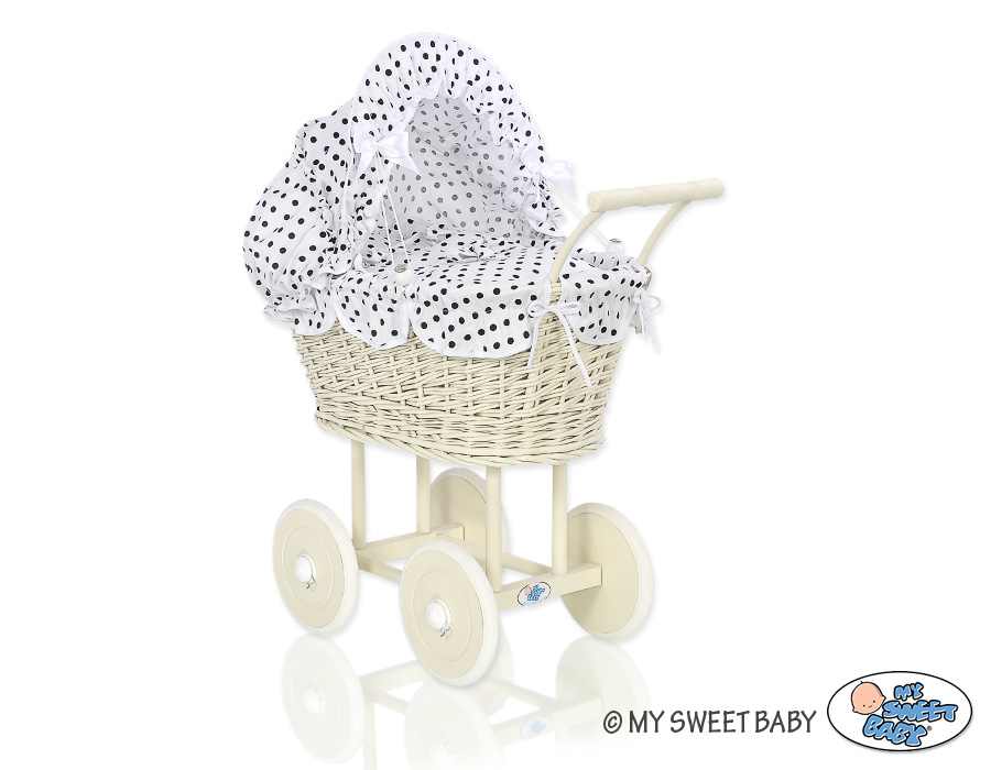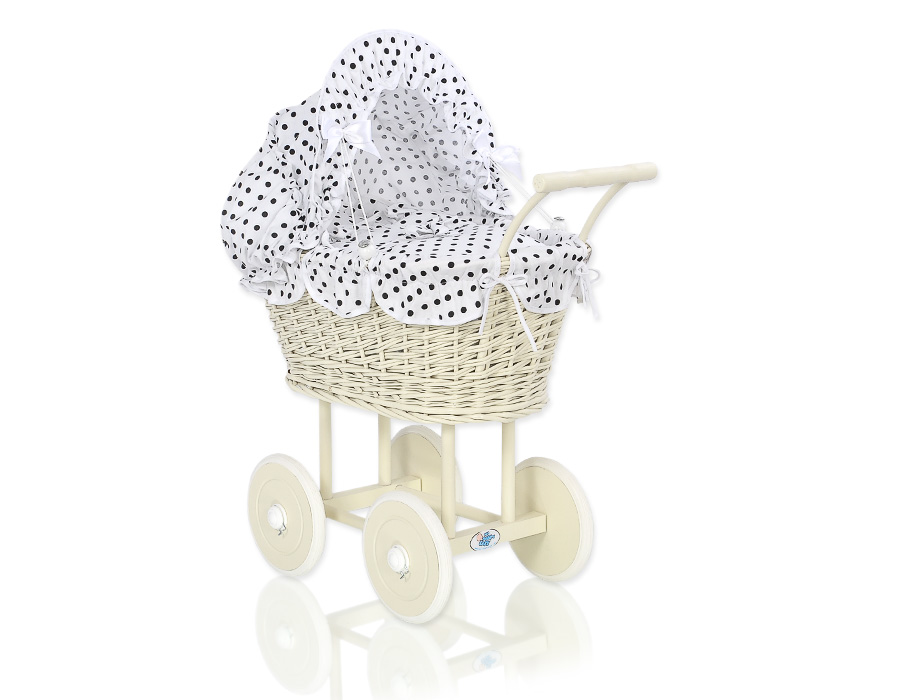 Kleinbaby.nl » Speelgoed Knuffels » Poppenwagens en Speelgoed » Poppenwagen van Riet » Poppenwagen Rotan Ivoor » Rieten poppenwagen met stoffen kap Ivoor Wit Zwart Polkaprikker