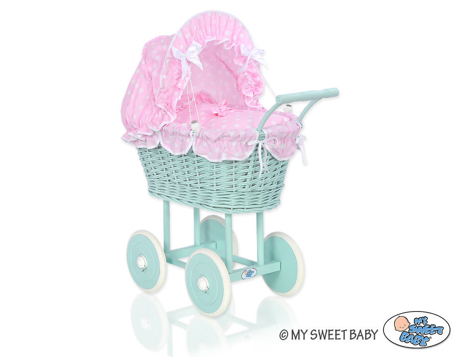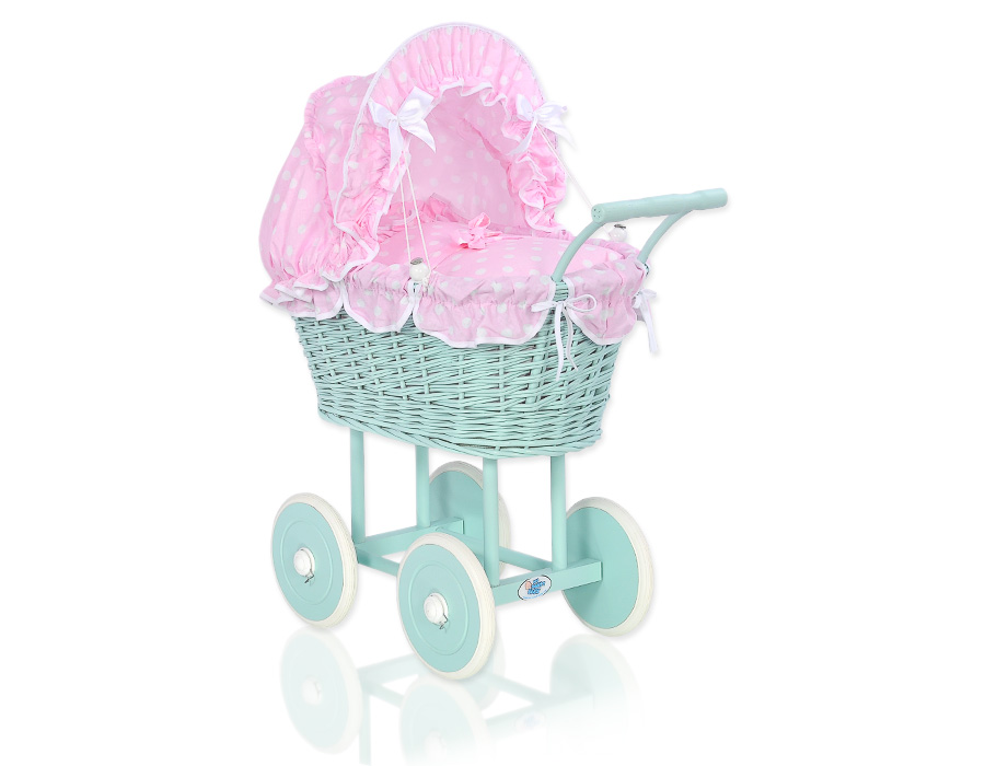 Rieten poppenwagen met stoffen kap Mint Roze PolkaprikkerRieten poppenwagen met stoffen kap Mint Roze PolkaprikkerRieten poppenwagen met stoffen kap Mint Roze Polkaprikker