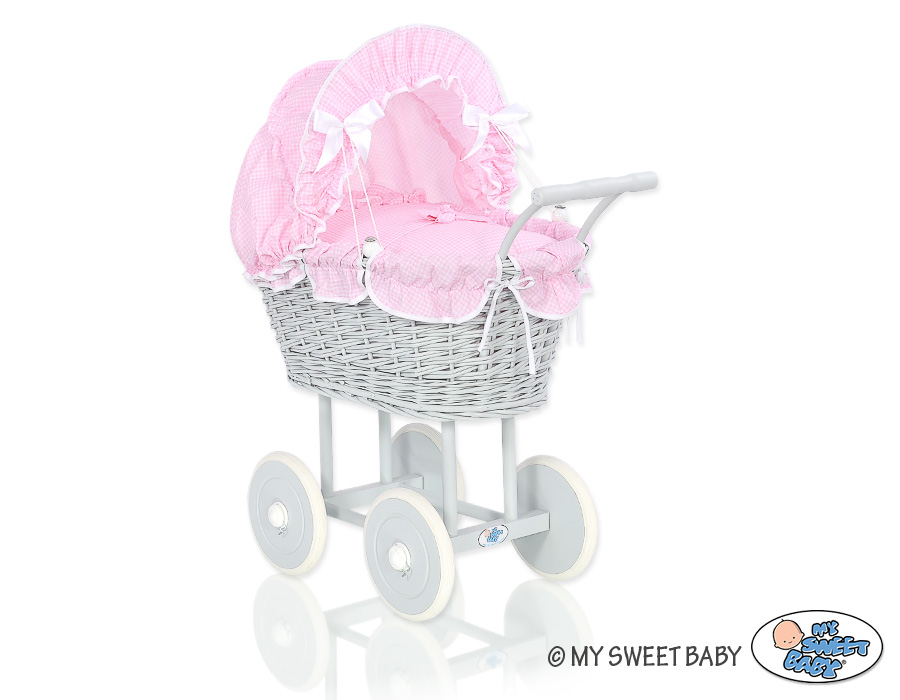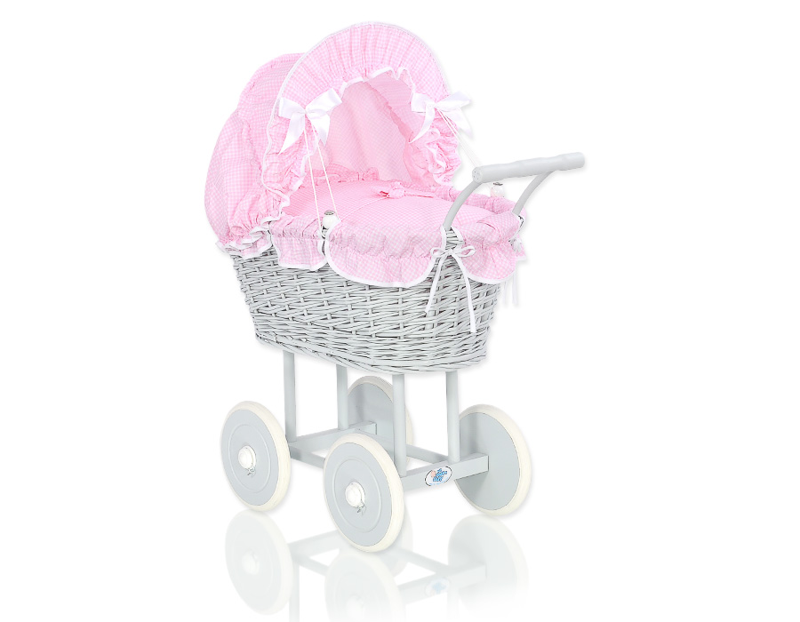 Kleinbaby.nl » Speelgoed Knuffels » Poppenwagens en Speelgoed » Poppenwagen van Riet » Poppenwagen Riet Grijs » Rieten poppenwagen met stoffen kap Roze Grijs Geruit