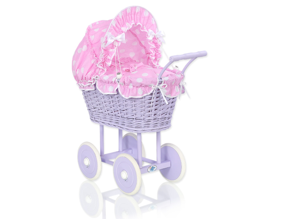 Rieten poppenwagen met stoffen kap Roze Purper Polkaprikker