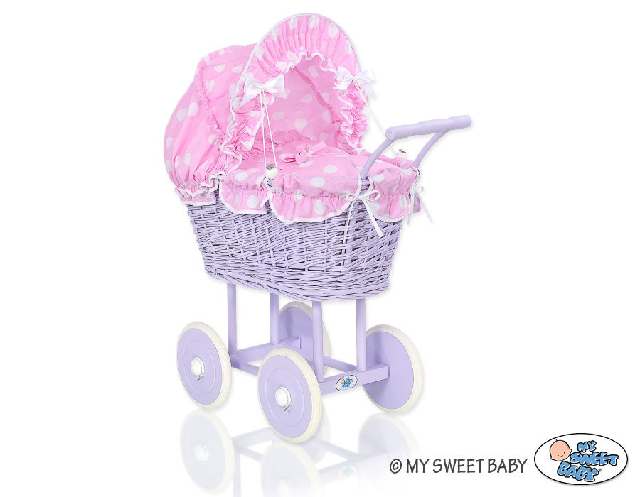 Kleinbaby.nl » Speelgoed Knuffels » Poppenwagens en Speelgoed » Poppenwagen van Riet » Poppenwagen van paars rotan » Rieten poppenwagen met stoffen kap Roze Purper Polkaprikker