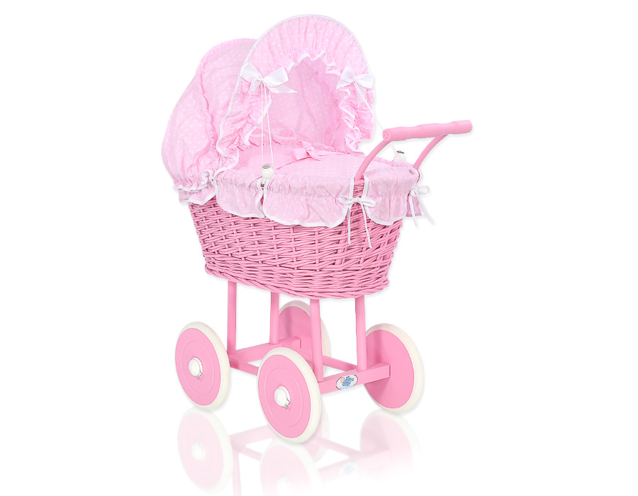 Rieten poppenwagen met stoffen kap Roze Wit PolkaprikkerRieten poppenwagen met stoffen kap Roze Wit PolkaprikkerRieten poppenwagen met stoffen kap Roze Wit Polkaprikker