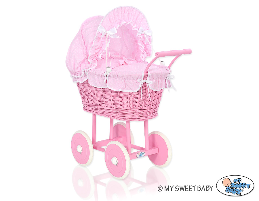 Kleinbaby.nl » Speelgoed Knuffels » Poppenwagens en Speelgoed » Poppenwagen van Riet » Rieten Poppenwagen Donker Roze » Rieten poppenwagen met stoffen kap Roze Wit Polkaprikker