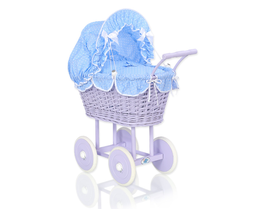 Rieten poppenwagen met stoffen kap Wit Blauw Purper PolkaprikkerRieten poppenwagen met stoffen kap Wit Blauw Purper PolkaprikkerRieten poppenwagen met stoffen kap Wit Blauw Purper Polkaprikker