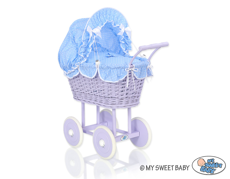 Kleinbaby.nl » Speelgoed Knuffels » Poppenwagens en Speelgoed » Poppenwagen van Riet » Poppenwagen van paars rotan » Rieten poppenwagen met stoffen kap Wit Blauw Purper Polkaprikker