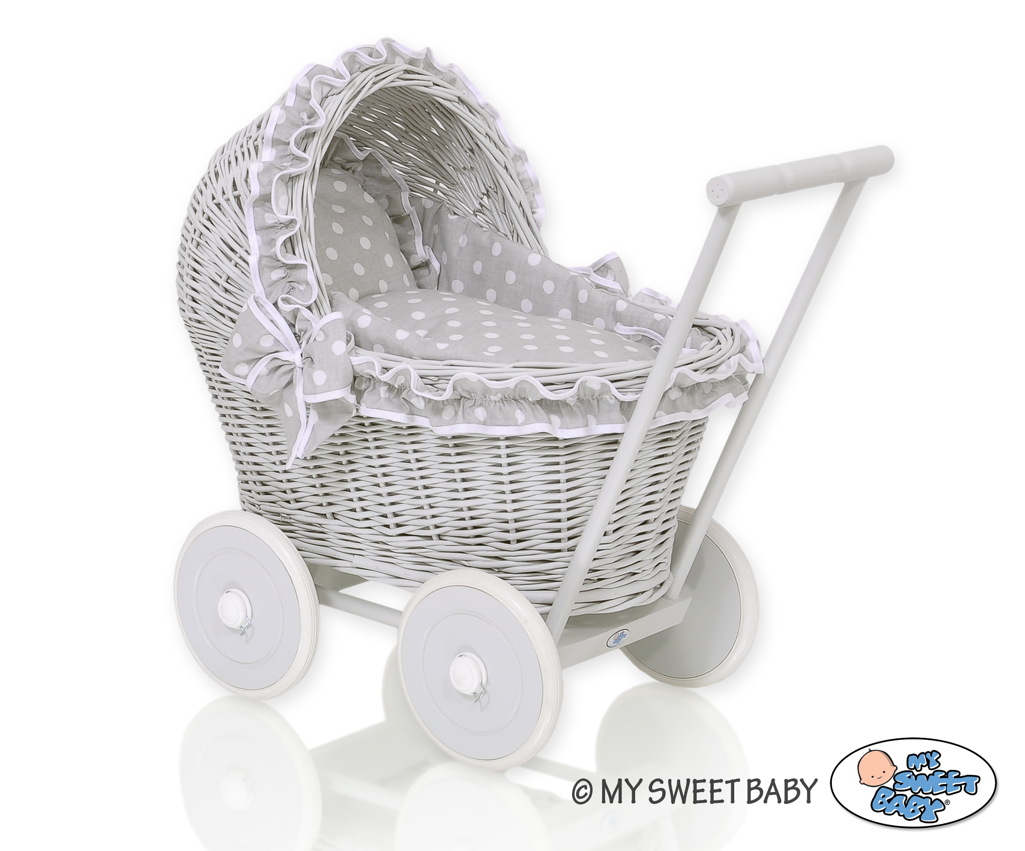 Kleinbaby.nl » Speelgoed Knuffels » Poppenwagens en Speelgoed » Poppenwagen van Riet » Poppenwagen Riet Grijs » Rieten poppenwagen met stoffen kap Wit Grijs Polkaprikker