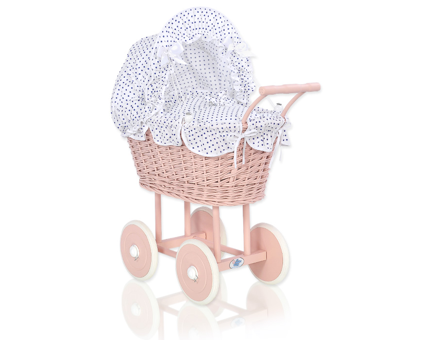 Rieten poppenwagen met stoffen kap Wit Marineblauw Polkaprikker PoederrozeRieten poppenwagen met stoffen kap Wit Marineblauw Polkaprikker PoederrozeRieten poppenwagen met stoffen kap Wit Marineblauw Polkaprikker Poederroze