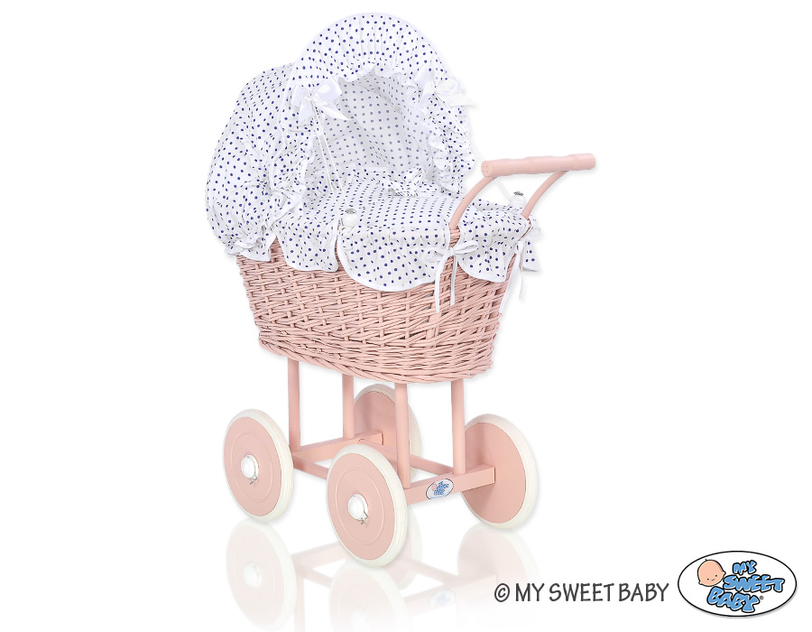 Kleinbaby.nl » Speelgoed Knuffels » Poppenwagens en Speelgoed » Poppenwagen van Riet » Poppenwagen Riet Poederroze » Rieten poppenwagen met stoffen kap Wit Marineblauw Polkaprikker Poederroze