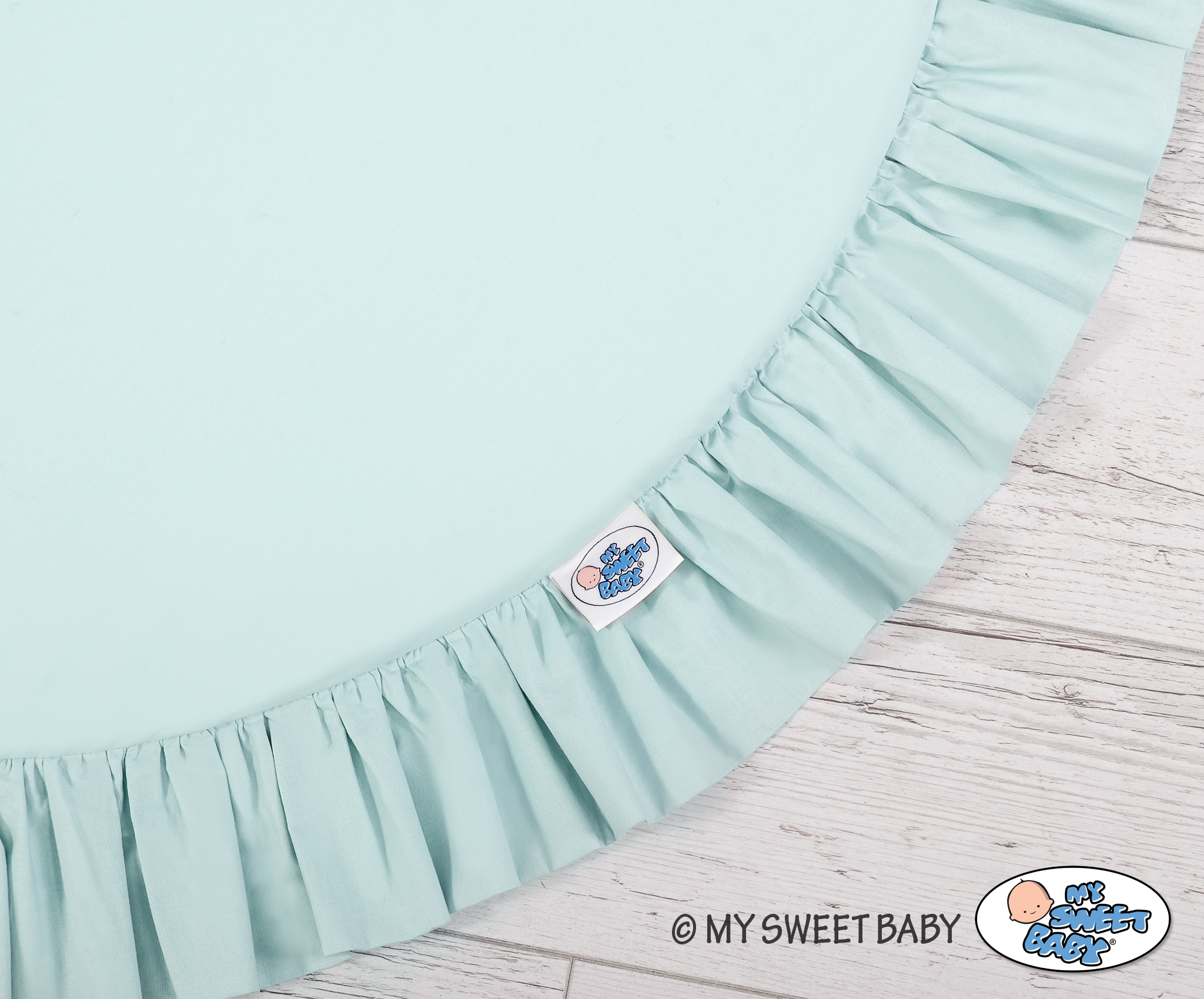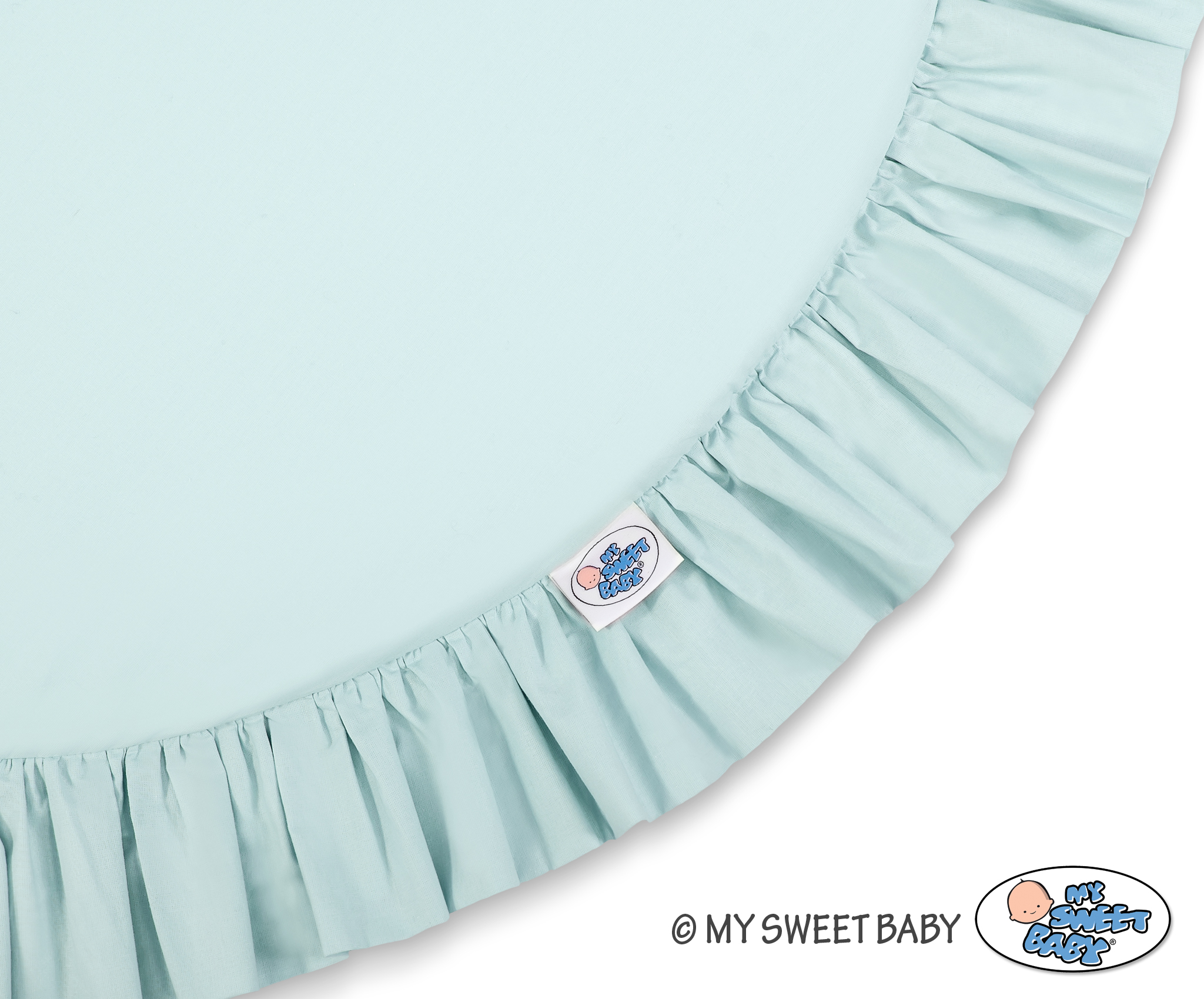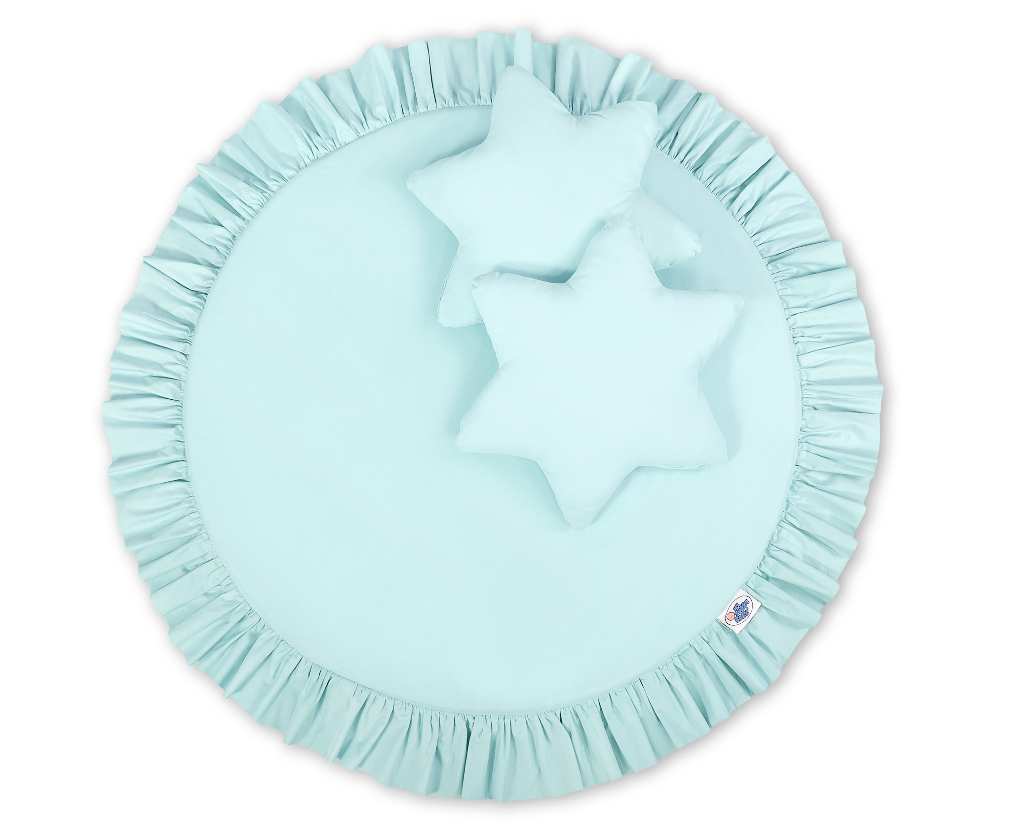 Een speelmat met ruche. Deze kan worden gebruikt als tapijt, speelmat of als vloermat voor de katoenen luifel. Deze speelmat kan vanaf de geboorte worden gebruikt als een plaats om te rusten of om op de buik te spelen. Het heeft een zachte vulling die de baby perfect isoleert van de harde en koude vloer. De hoes is gemaakt van Oekotex-gecertificeerd 100% katoen. De bodem van de speelmat is gemaakt van een modern, anti-allergie en gecertificeerd materiaal. De bodem kan afgenomen en gewassen worden.