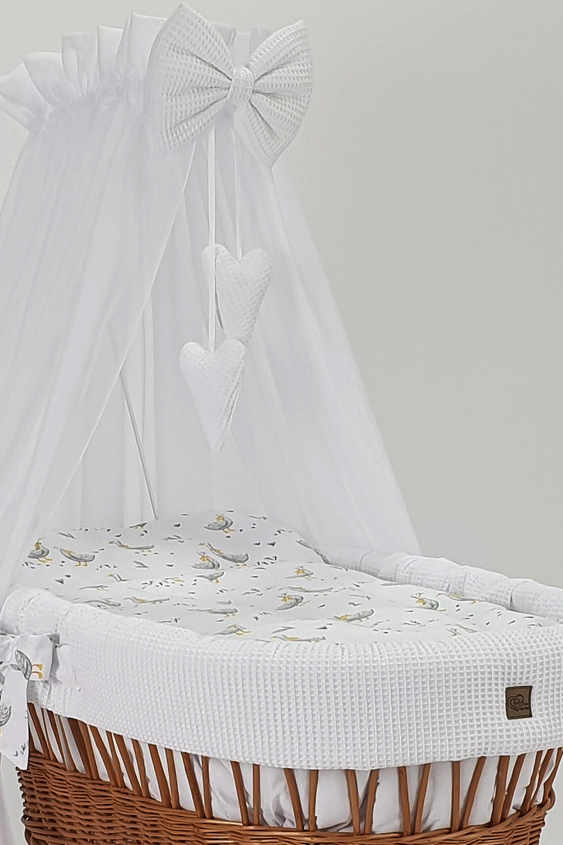 De binnenkant van de wieg is bekleed met zachte, ademende wafelkatoen in een elegante witt kleur. De dekenset is afgewerkt met een schattig gansjesmotief- perfect voor een rustgevende en liefdevolle babykamer.