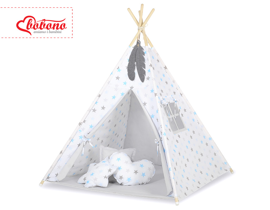 Kleinbaby.nl » Speelgoed Knuffels » Tipi-tenten » Tipi-tenten » Tipi-tent Speelkleed GRATIS decoratieve veren Blauw Grijs Sterren